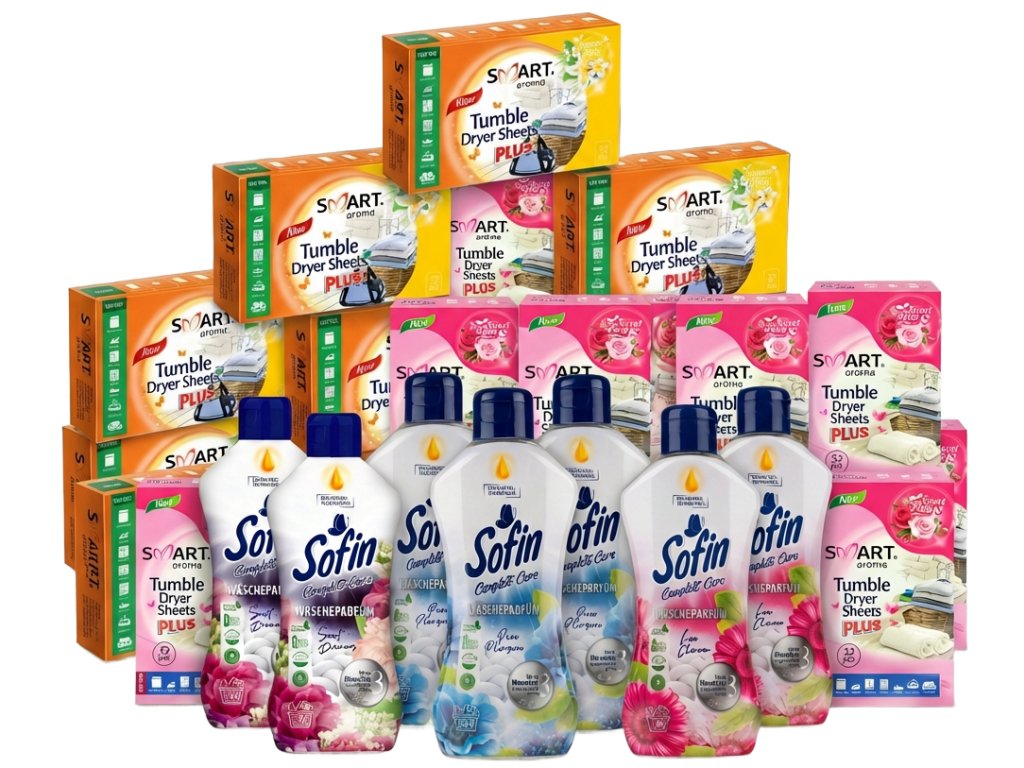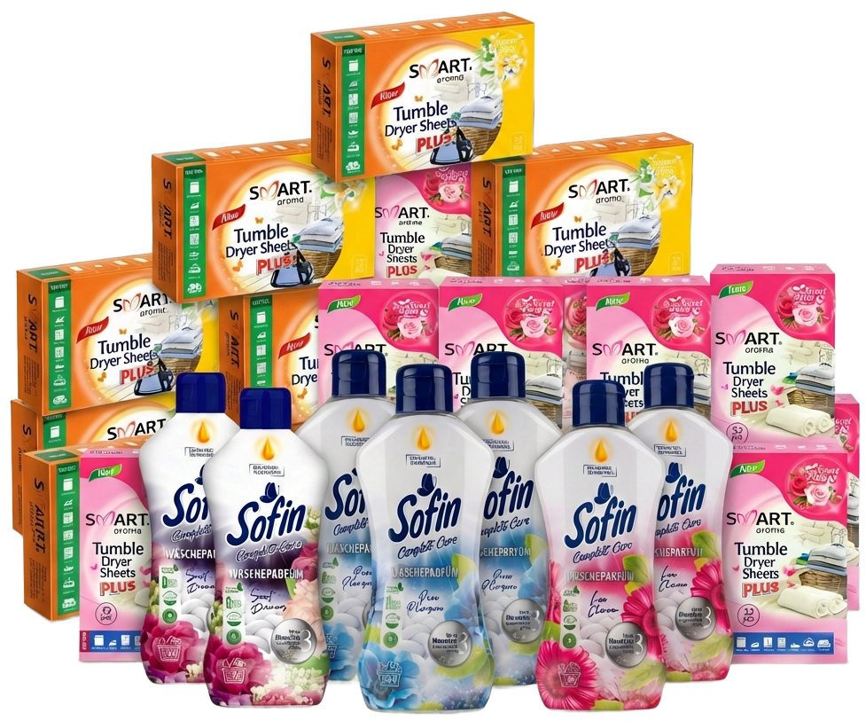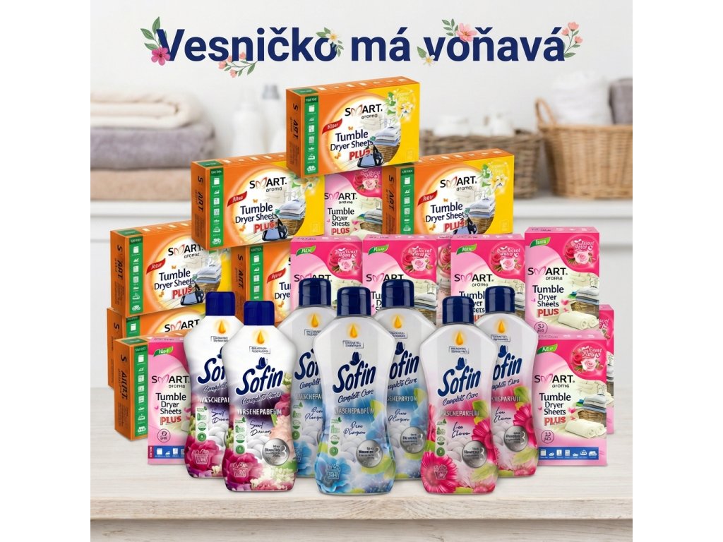 „Vesničko má voňavá“ – mega set pro voňavé prádlo (praní + sušička), Sofin Euforia 9×300 ml + Smart Aroma 6×32 ks (mix vůní) Mega zásoba, mix vůní, parfém do pračky i sušičky + antistatické ubrousky do sušičky