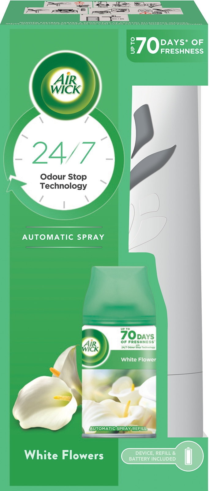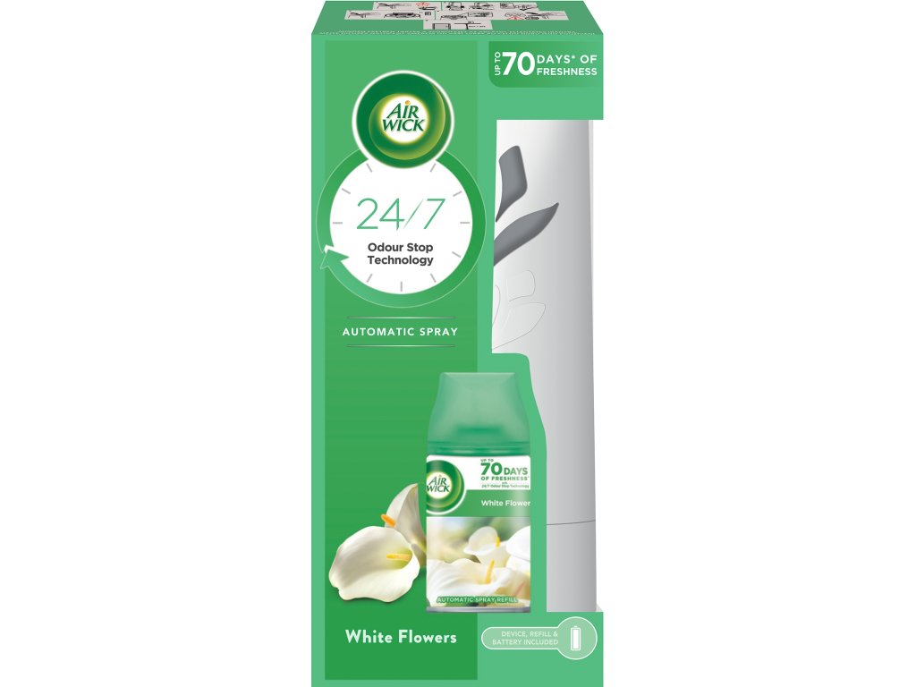 AIR WICK automatický osvěžovač vzduchu bílý+ náplň White Flowers 250ml Automatický osvěžovač vzduchu s vůní čerstvých květin, která přináší pocit klidu a pohody.