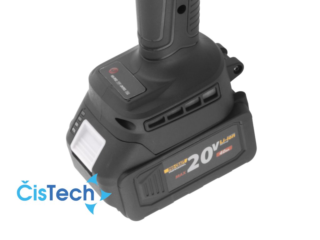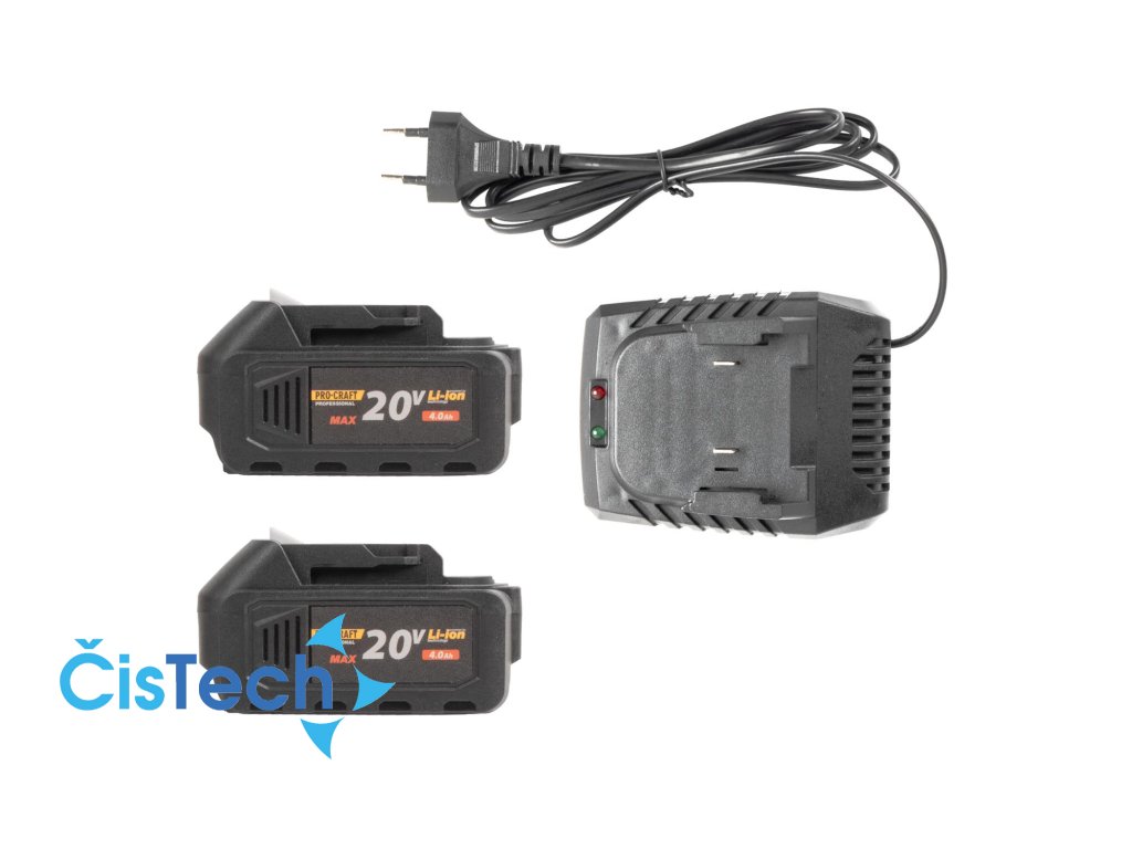 Pro zajištění nepřetržitého provozu jsou součástí dodávky 2 baterie 4,0 Ah 20 V a nabíječka. Po vybití jedné baterie ji můžete okamžitě začít nabíjet a pokračovat v práci s druhou. Doba plného nabití obvykle není delší než průměrná provozní doba od jedné baterií, takže můžete pracovat zcela nepřerušovaně.