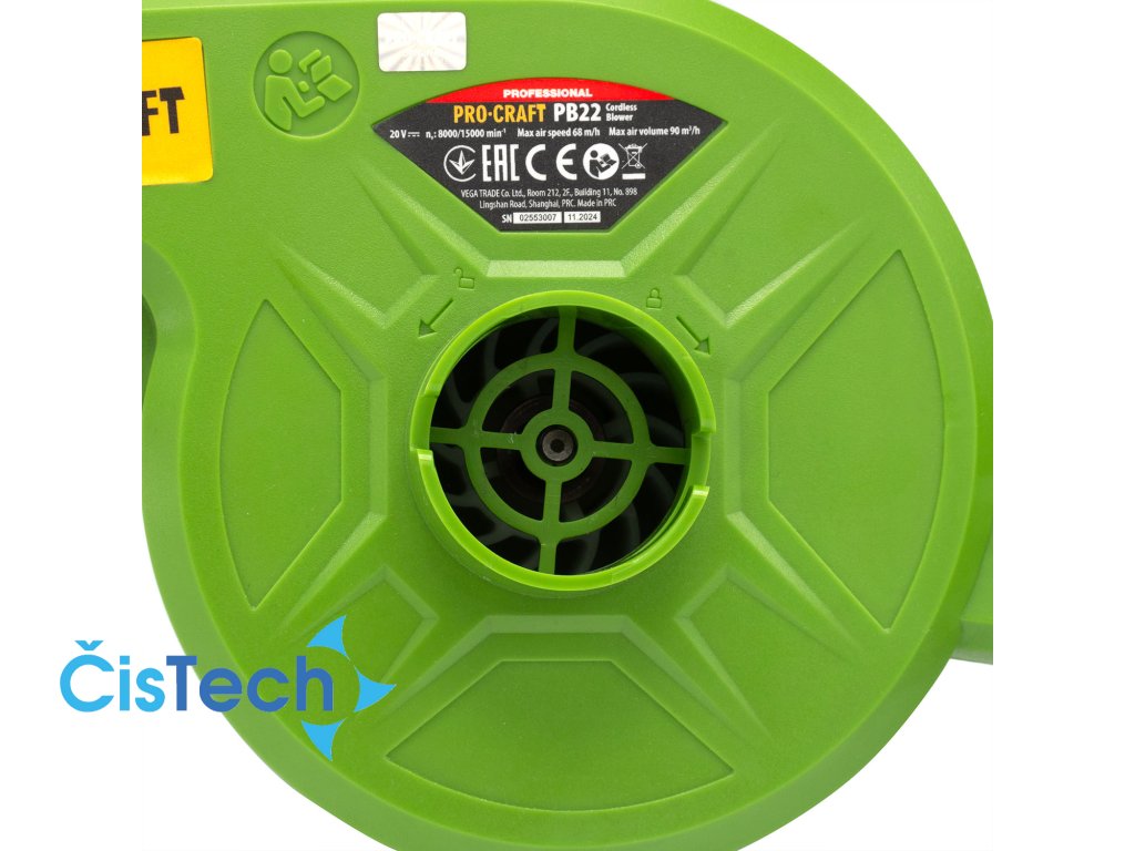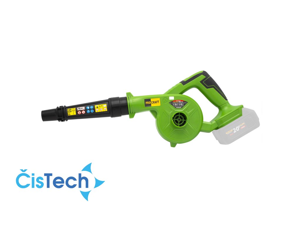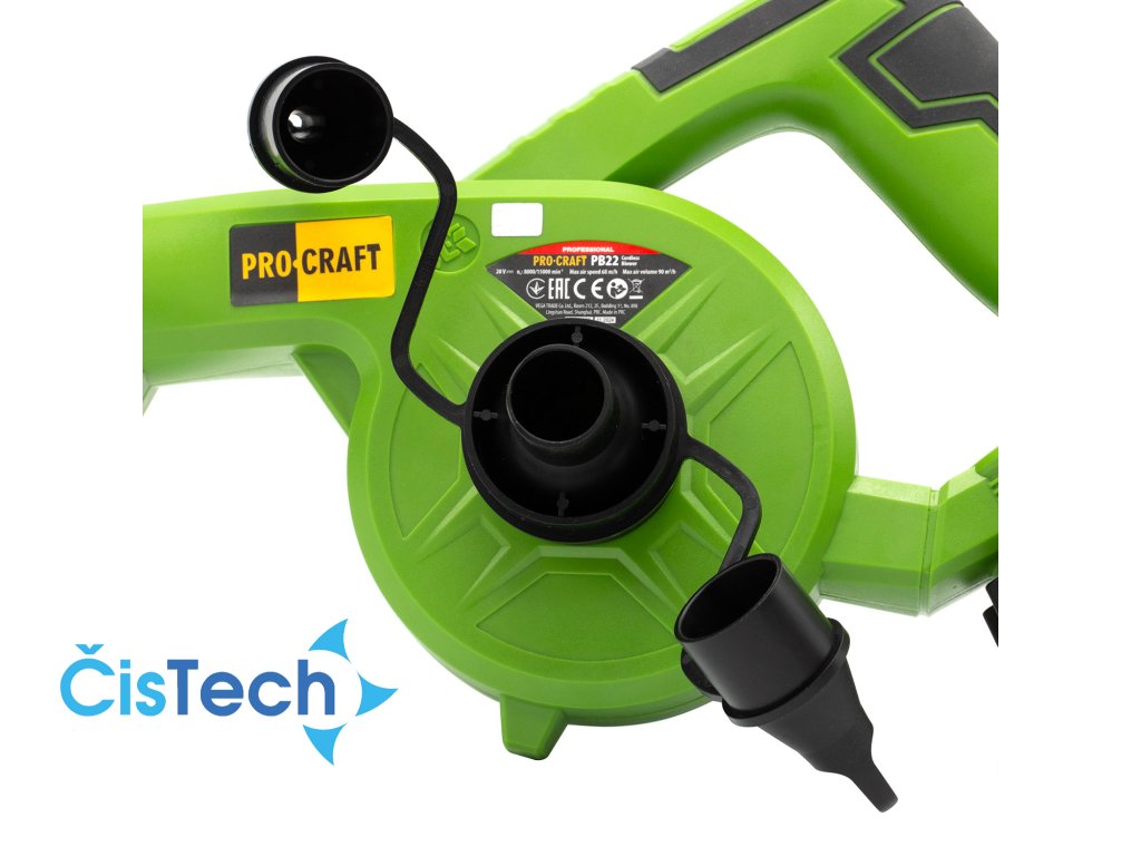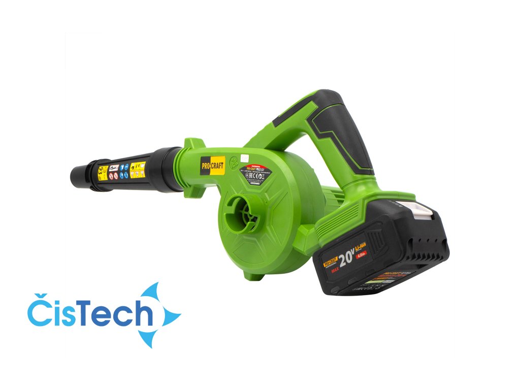 Aku fukar Procraft PB22bb (bez baterie a nabíječky) Doporučená baterie: 20V 4Ah Li-ion Otáčky (min.-1) 8000-15000 Max. průtok vzduchu, m3/h 90 Max. rychlost vzduchu (km/h) 68 Hmotnost, 0,91 kg.