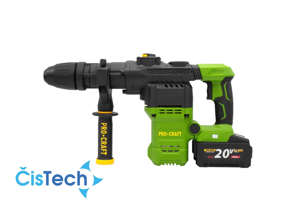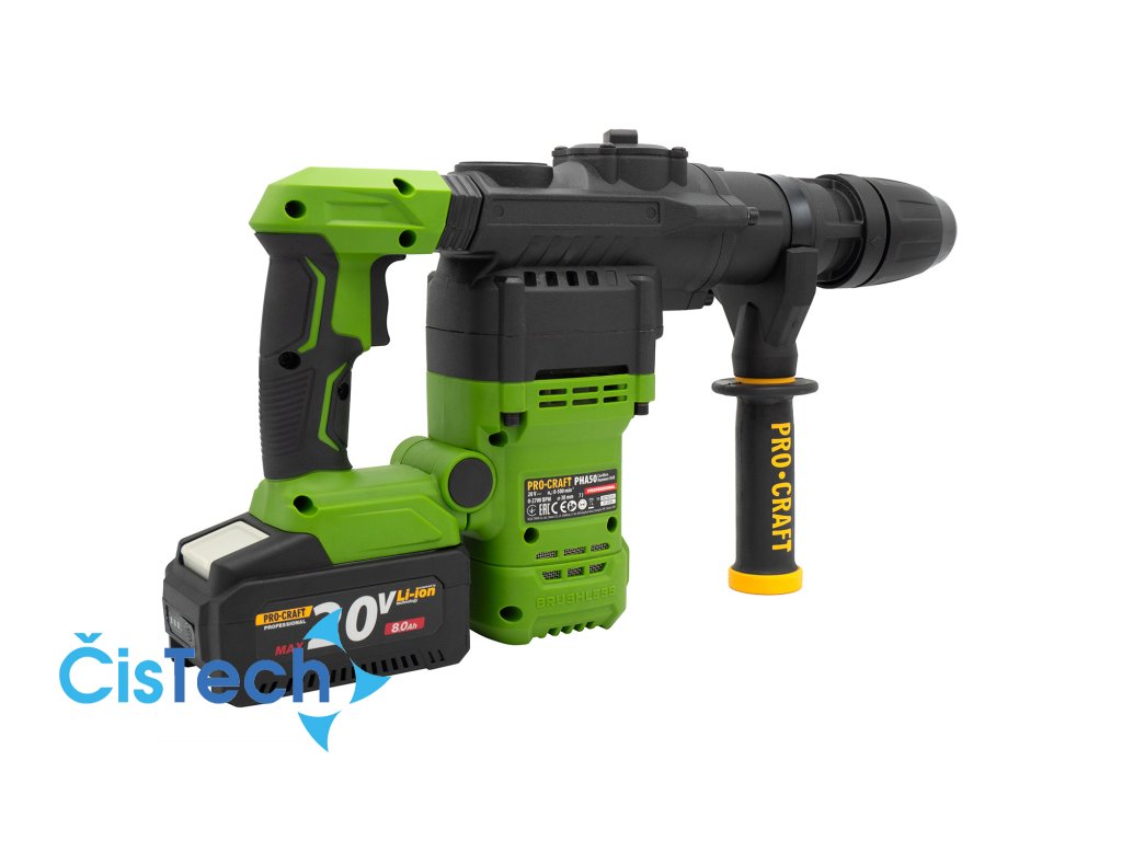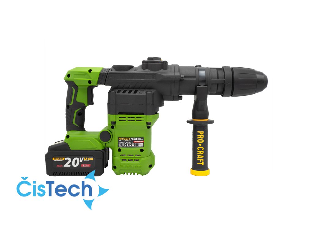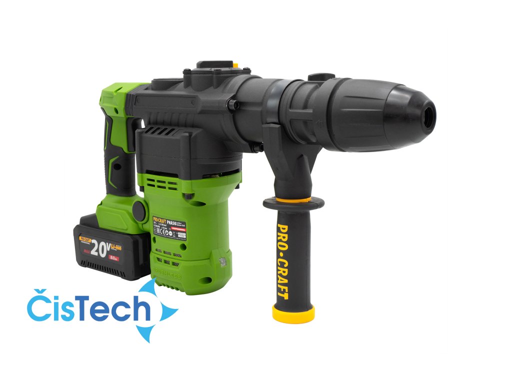 Aku vrtací kladivo Procraft PHA50-1b-c s bezuhlíkovým motorem. Režimy vrtání s příklepem a sekání, síla úderu 7 J, otáčky 0–500/min⁻¹ , příklepy 0–2700/min⁻¹ . Ideální pro stavební a renovace práce. Součástí balení je baterie, nabíječka a kufr.