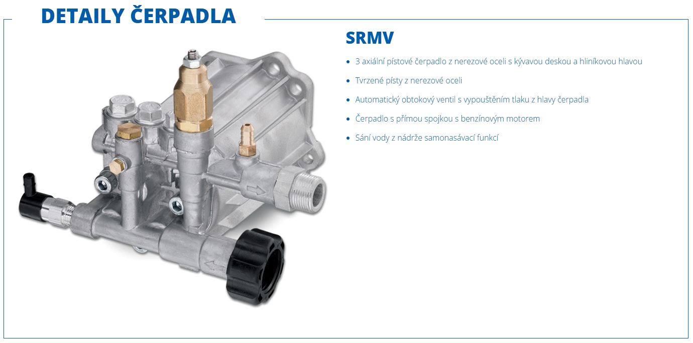 Klíčovým prvkem celého zařízení je čerpadlo SRMV. Jde o 3 axiální pístové čerpadlo z nerezové oceli s kývavou deskou a hliníkovou hlavou. Tato konstrukce je vhodná pro výkonná zařízení určená pro náročnější práci než běžné hobby modely. Hliníková hlava přispívá k rozumnému poměru mezi odolností a hmotností, zatímco tvrzené písty z nerezové oceli podporují dlouhodobou mechanickou odolnost při provozu.