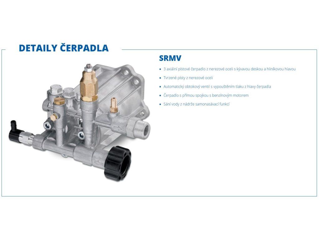 Klíčovým prvkem celého zařízení je čerpadlo SRMV. Jde o 3 axiální pístové čerpadlo z nerezové oceli s kývavou deskou a hliníkovou hlavou. Tato konstrukce je vhodná pro výkonná zařízení určená pro náročnější práci než běžné hobby modely. Hliníková hlava přispívá k rozumnému poměru mezi odolností a hmotností, zatímco tvrzené písty z nerezové oceli podporují dlouhodobou mechanickou odolnost při provozu.