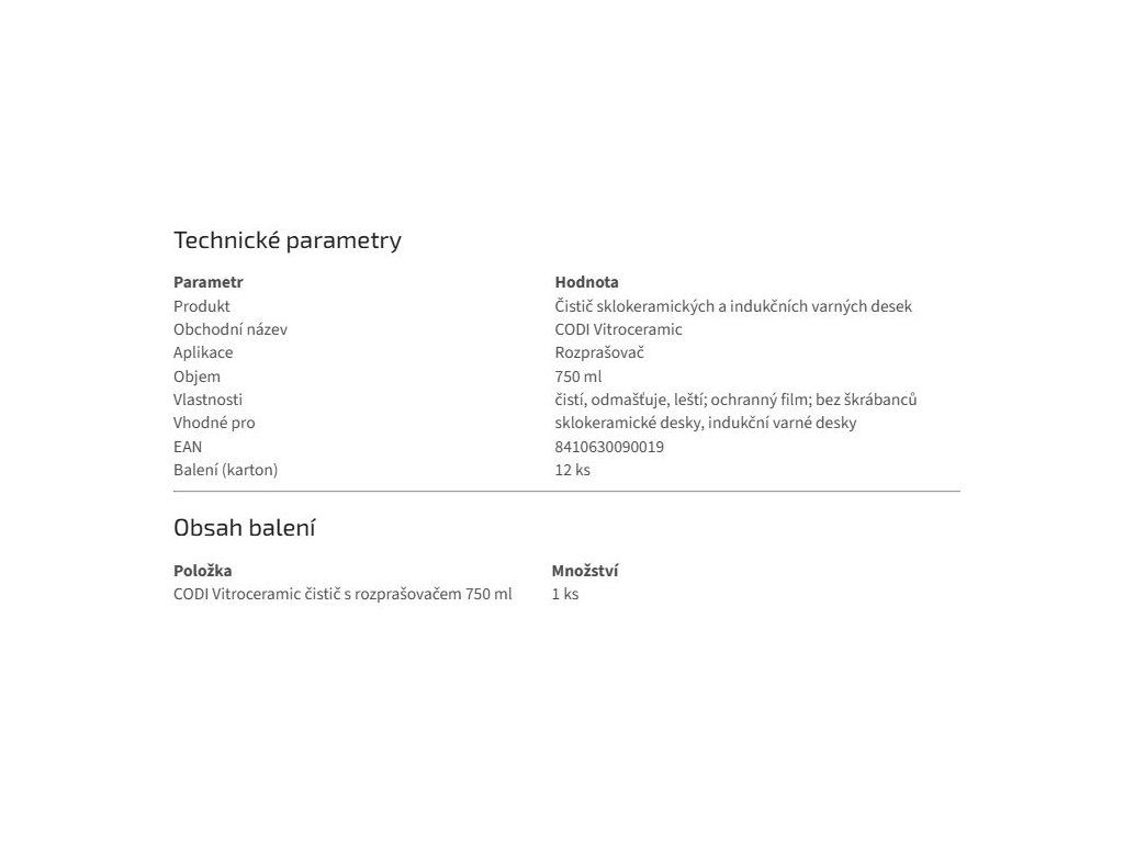 - Oproti univerzálním odmašťovačům je CODI Vitroceramic cílený na sklokeramiku a indukci a je navržen tak, aby nezanechával nežádoucí škrábance při správném použití.