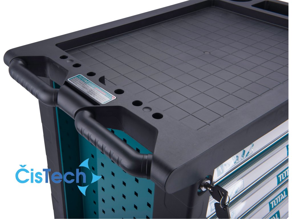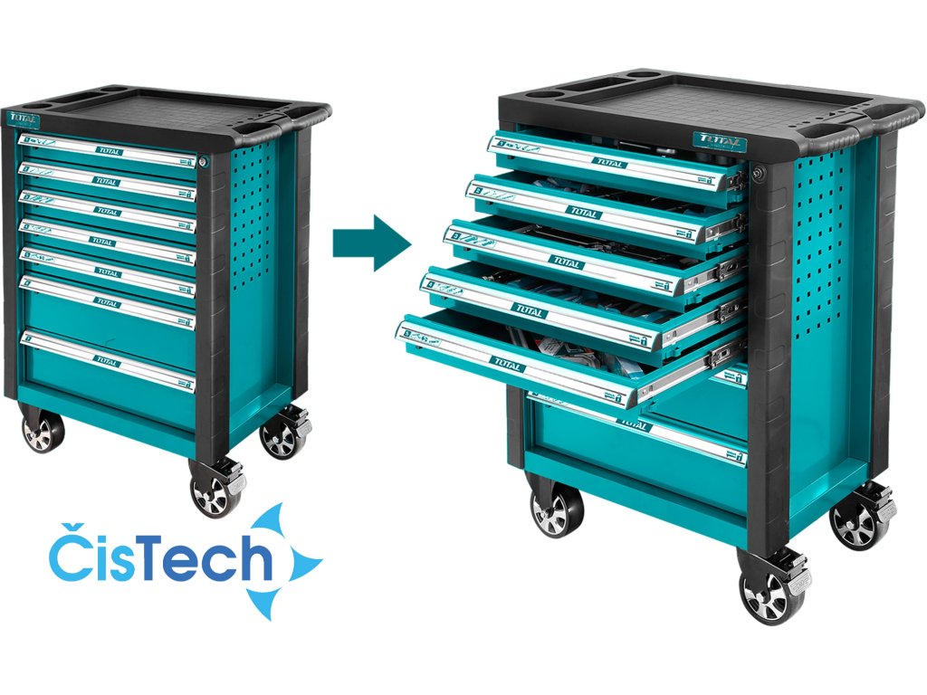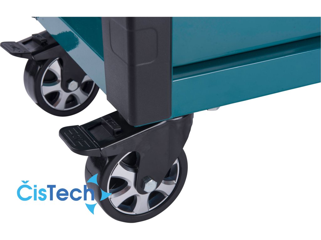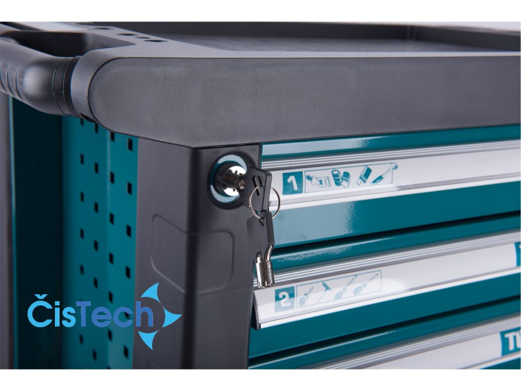 Dílenský vozík obsahuje vysoce kvalitní nářadí z CrV oceli a dalších lepších slitin. Vozík obsahuje 7 šuplíků a má rozměry 765x465x812mm. Rozměry horních 5 šuplíků jsou 536x410x74,5mm. Spodní dva šuplíky jsou hlubší s rozměrem 536x410x153,5mm. Vozík je uzamykatelný jedním klíčem. Je vybaven brzdami na obě dvě zadní transportní kolečka. Pojezdy zásuvek s kulovými ložisky jsou vybaveny zarážkou proti celkovému výsuvu. Pro snadnou manipulaci je vozík nahoře vybaven úchopy pro ruce. EXTRA VLASTNOSTI: * 7ks šuplíkůDoplňkové parametry