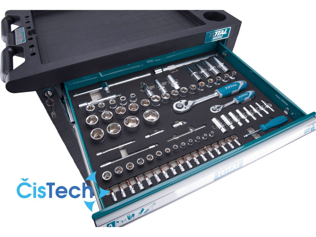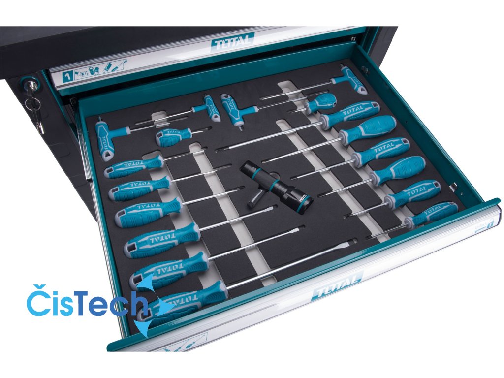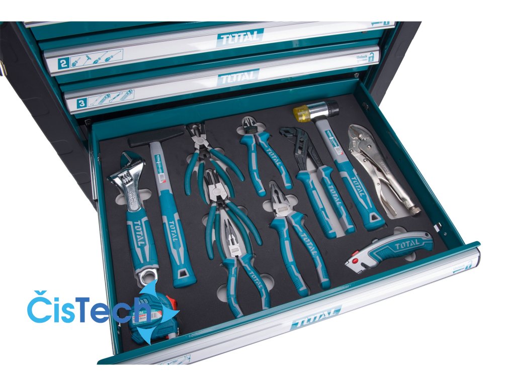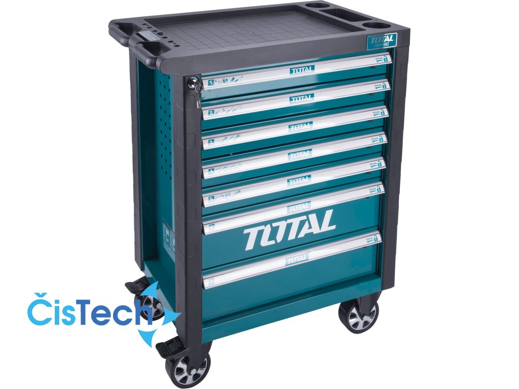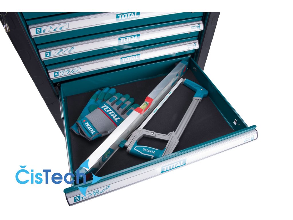 Dílenský vozík obsahuje vysoce kvalitní nářadí z CrV oceli a dalších lepších slitin. Vozík obsahuje 7 šuplíků a má rozměry 765x465x812mm. Rozměry horních 5 šuplíků jsou 536x410x74,5mm. Spodní dva šuplíky jsou hlubší s rozměrem 536x410x153,5mm. Vozík je uzamykatelný jedním klíčem. Je vybaven brzdami na obě dvě zadní transportní kolečka. Pojezdy zásuvek s kulovými ložisky jsou vybaveny zarážkou proti celkovému výsuvu. Pro snadnou manipulaci je vozík nahoře vybaven úchopy pro ruce. EXTRA VLASTNOSTI: * 7ks šuplíkůDoplňkové parametry