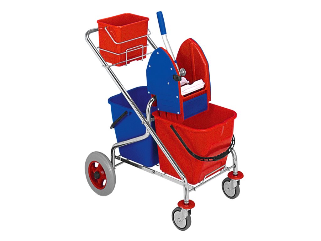 Profesionální pochromovaný sklapovací dvojkbelíkový úklidový vozík na kolečkách se ždímačkou a dvěma kbelíky o objemu 17 l. Vylepšen většími zadními kolečky pro snadnější zdolávání nerovností nebo malých schodů.