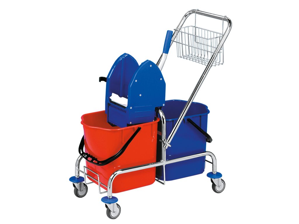 Profesionální pochromovaný dvojkbelíkový úklidový vozík na kolečkách se ždímačkou a dvěma kbelíky o objemu 25 l.