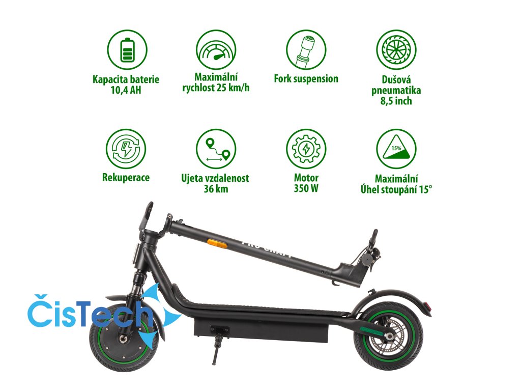 DS350S je vybavena výkonným 350W motorem, který dosahuje maximální rychlosti až 25 km/h. K dispozici jsou čtyři jízdní režimy (Chodecký, ECO, Standard, Sport), které vám umožní přizpůsobit rychlost aktuální situaci. Pro bezpečné zastavení je koloběžka vybavena zadní kotoučovou brzdou, která zajišťuje spolehlivý a plynulý brzdný účinek.
