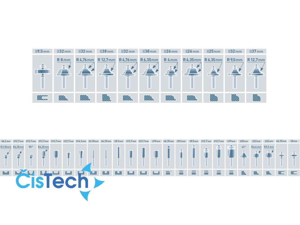 EXTRA VLASTNOSTI: * frézy opatřené řezacím břitem z tvrdokovu, vodicím kolečkem s kvalitním ložiskem a upínací stopkou o průměru 8mm * SK karbidové plátky s vysokou odolností, pro obrábění tvrdého dřeva, plastu a lisovaných desekDoplňkové parametry