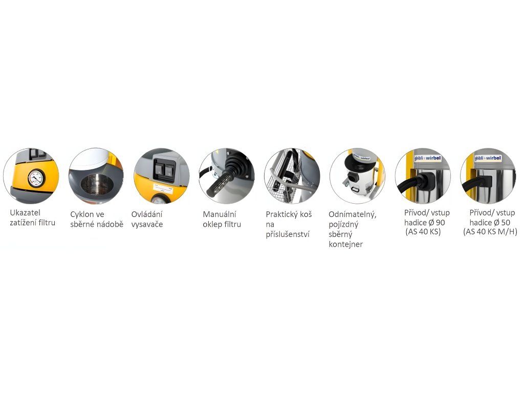 Součástí standardní výbavy verze AS 40 KS je příslušenství určené pro každodenní práci v provozu. K dispozici je sací hadice 3 m, zahnutá sací trubka, podlahová nastavitelná sací hubice suchá 0,4 m, kruhová kartáčová hubice, štěrbinová hubice, patronový filtr o ploše 1,06 m², PES filtr pro systém manuálního oklepu a připojení Ø 50.