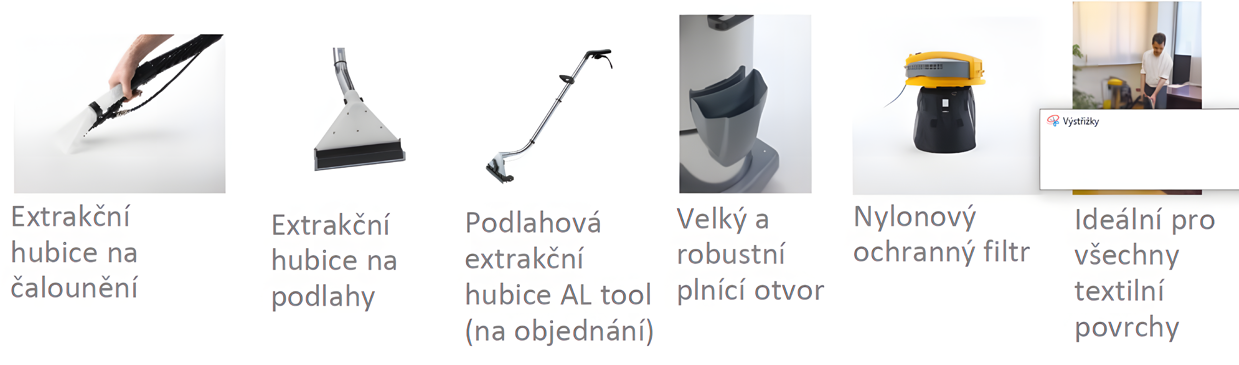 V profesionálním úklidu je výhodné, když jeden stroj zvládne více typů úloh bez nutnosti pořizovat samostatné zařízení pouze na podlahy nebo pouze na čalounění. Standardní výbava tohoto modelu tak odpovídá požadavkům na běžné profesionální nasazení v praxi.