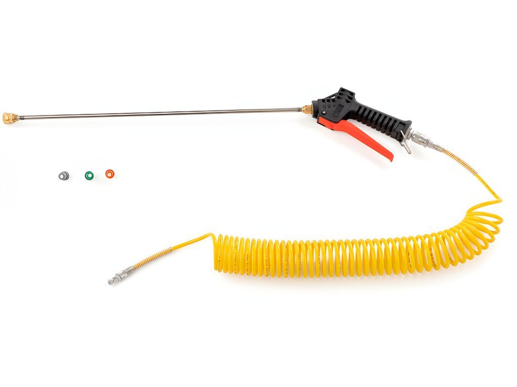Velkou praktickou výhodou tohoto modelu je kombinace prodloužitelné spirálové hadice s maximální délkou 7,5 m a napájecího kabelu o délce 15 m. Tato konfigurace umožňuje pohodlné pokrytí větší pracovní plochy z jednoho místa a omezuje nutnost častého přesouvání stroje nebo hledání nového připojení.