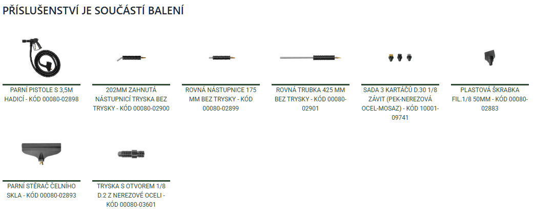 | Parní pistole (s hadicí) | Ergonomická pistole s ovládáním páry/detergentu a bezpečnostní pojistkou. |