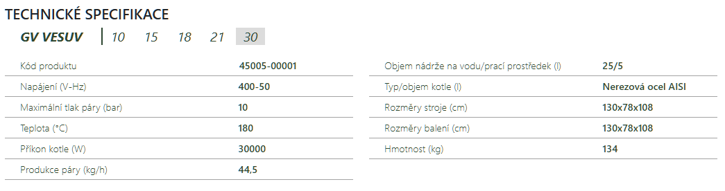 | Parametr | Hodnota (Model GV Vesuvio 30) |