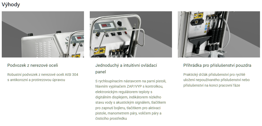Díky topnému výkonu 30 kW generuje tento model téměř 3x více páry než základní 10kW verze. To znamená 3x rychlejší práci a schopnost čistit i silně znečištěné povrchy jediným tahem. -