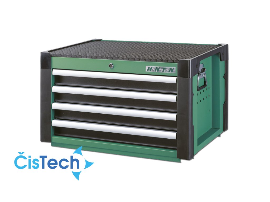 Kovový montážní skříň na nářadí se 4 zásuvkami.. Zásuvky na kuličkových ložiskách lze vysunout do 40cm. Horní pracovní plocha i zásuvky jsou vypodloženy protiskluzovou podložkou. Součástí jsou uzamykatelné 4 nízké zásuvky. Lze použít jako nástavba k vozíku HA103Doplňkové parametry