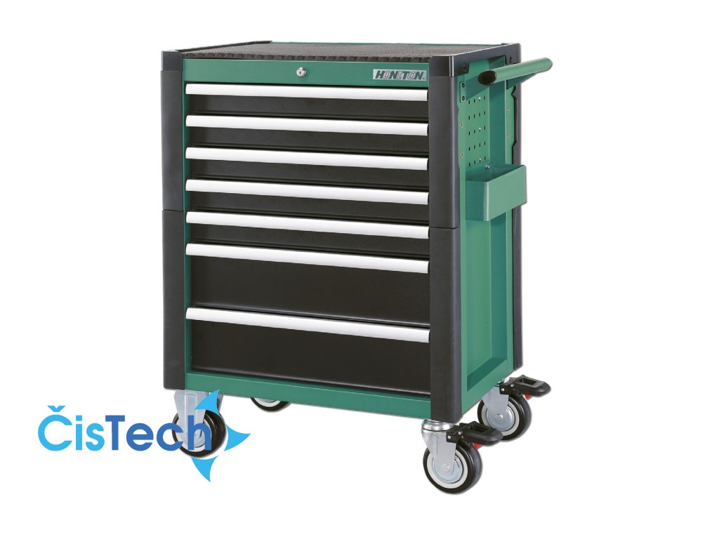 Kovový montážní vozík na nářadí se 7 zásuvkami. Dvě pevná a dvě otočná kola s poziční brzdou. Zásuvky s kuličkovými ložisky lze vysunout do 40 cm. Horní pracovní plocha i zásuvky jsou vypodloženy protiskluzovou podložkou. Držadlo pro manipulaci s vozíkem lze umístit z pravé i levé strany. Součástí je 5 nízkých a 2 vysoké uzamykatelné zásuvky.Doplňkové parametry