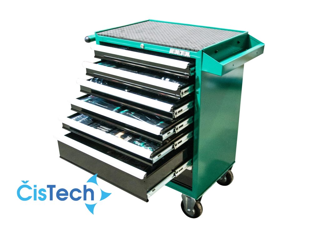 Kovový montážní vozík na nářadí se 7 zásuvkami. Dvě pevná a dvě otočná kola s poziční brzdou. Zásuvky s kuličkovými ložisky lze vysunout do 40 cm. Horní pracovní plocha i zásuvky jsou vypodloženy protiskluzovou podložkou. Držadlo pro manipulaci s vozíkem lze umístit z pravé i levé strany. Součástí je 5 nízkých a 2 vysoké uzamykatelné zásuvky.Doplňkové parametry