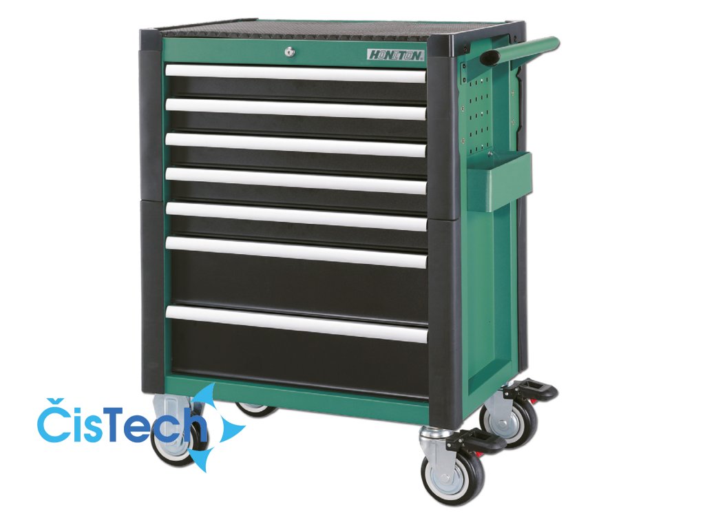 Kovový montážní vozík na nářadí se 7 zásuvkami. Dvě pevná a dvě otočná kolečka s poziční brzdou. Zásuvky na kuličkových ložiskách lze vysunout do 40cm. horní pracovní plocha i zásuvky jsou vypodloženy protiskluzovou podložkou. Součástí jsou uzamykatelné zásuvky. Má 5 nízkých a 2 vysoké zásuvky.Doplňkové parametry