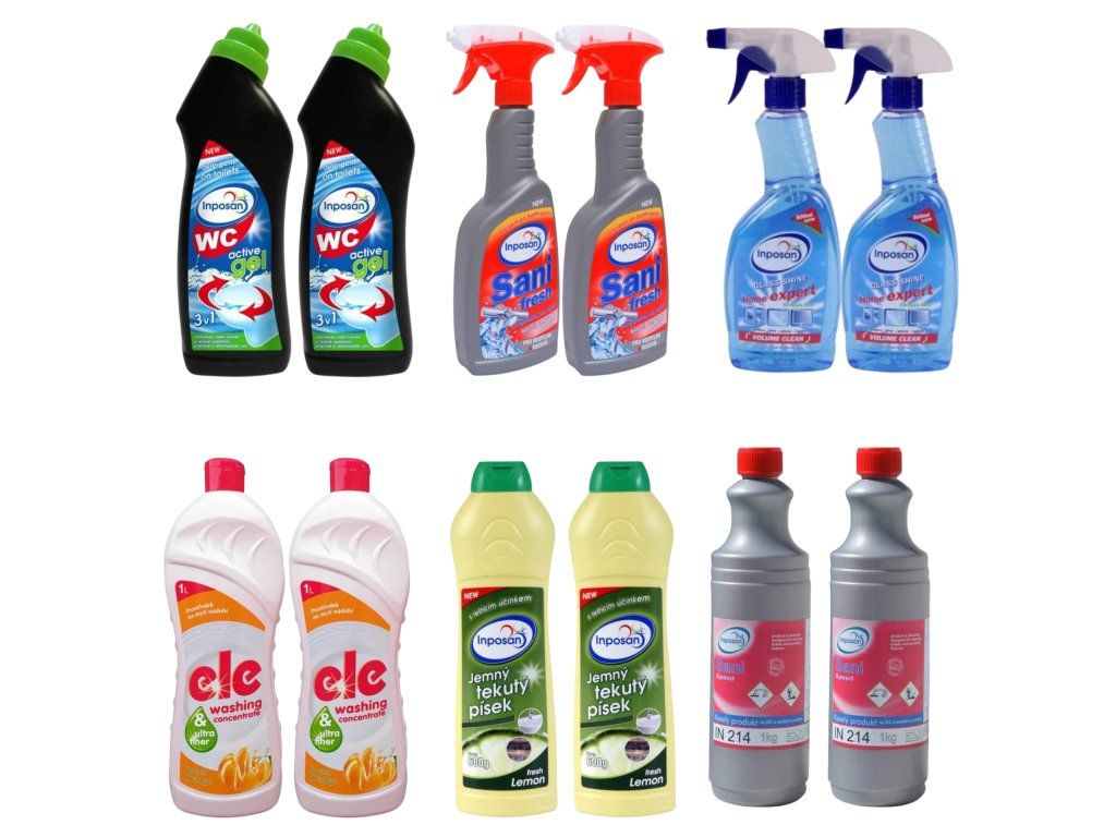 INPOSAN výhodný set profesionálního úklidu 12 ks – kuchyně, koupelna, WC, sklo a nádobí výhodná sada čisticích prostředků pro kompletní úklid