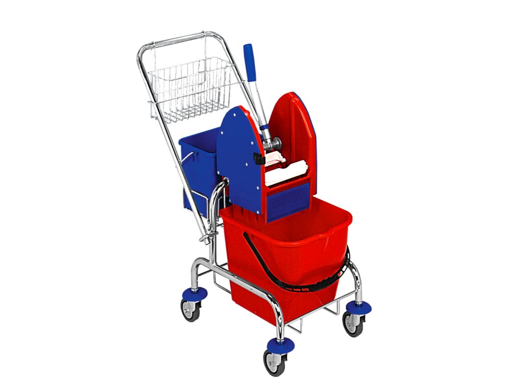 Profesionální pochromovaný jednokbelíkový úklidový vozík na kolečkách se ždímačkou a kbelíkem o objemu 17 l.