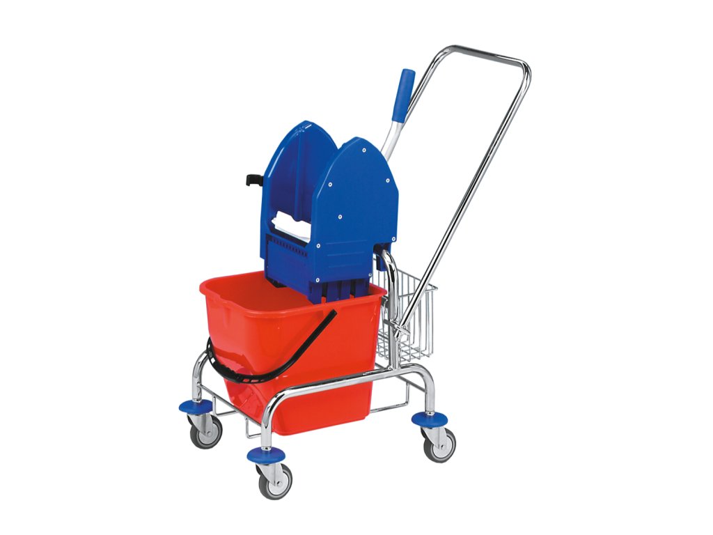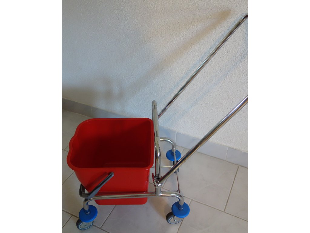 Profesionální pochromovaný jednokbelíkový úklidový vozík na kolečkách se ždímačkou a kbelíkem o objemu 17 l.