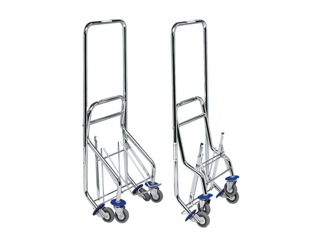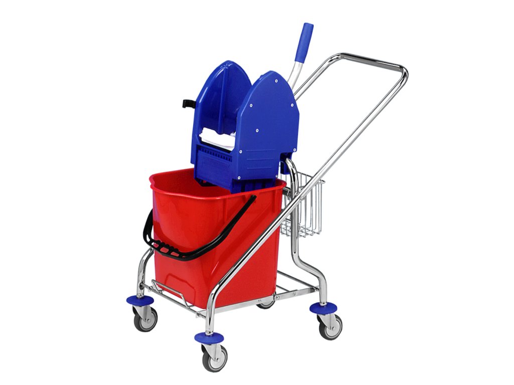Profesionální sklapovací pochromovaný jednokbelíkový úklidový vozík na kolečkách se ždímačkou a kbelíkem o objemu 25 l.