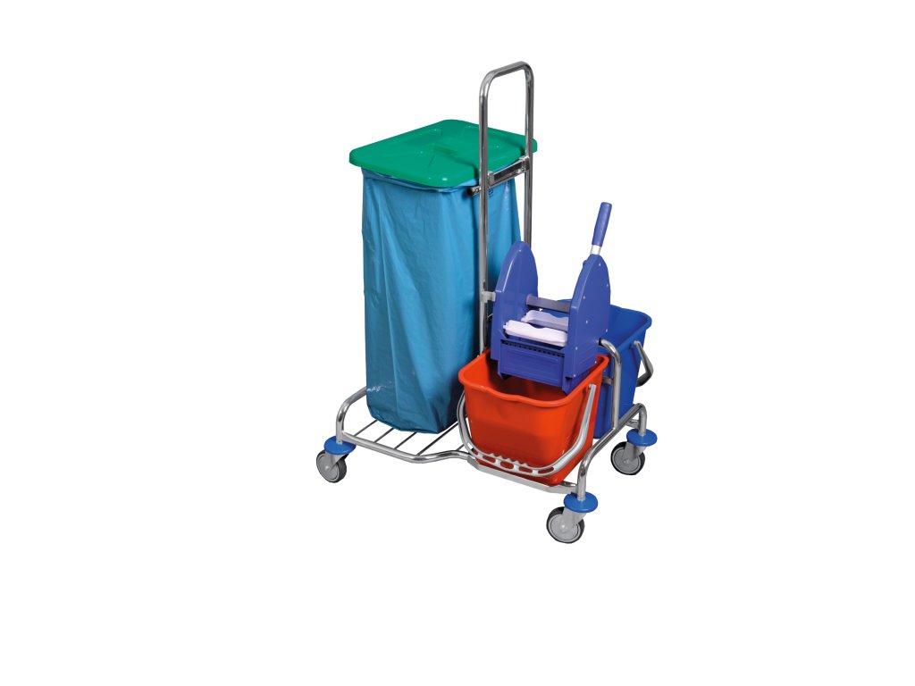 V ceně vozíku: kovová konstrukce na kolečkách pr. 100 mm, držák pytle 120 l (se svorkami pytle), 2x kbelík 17 l, ždímač, víko 120 l