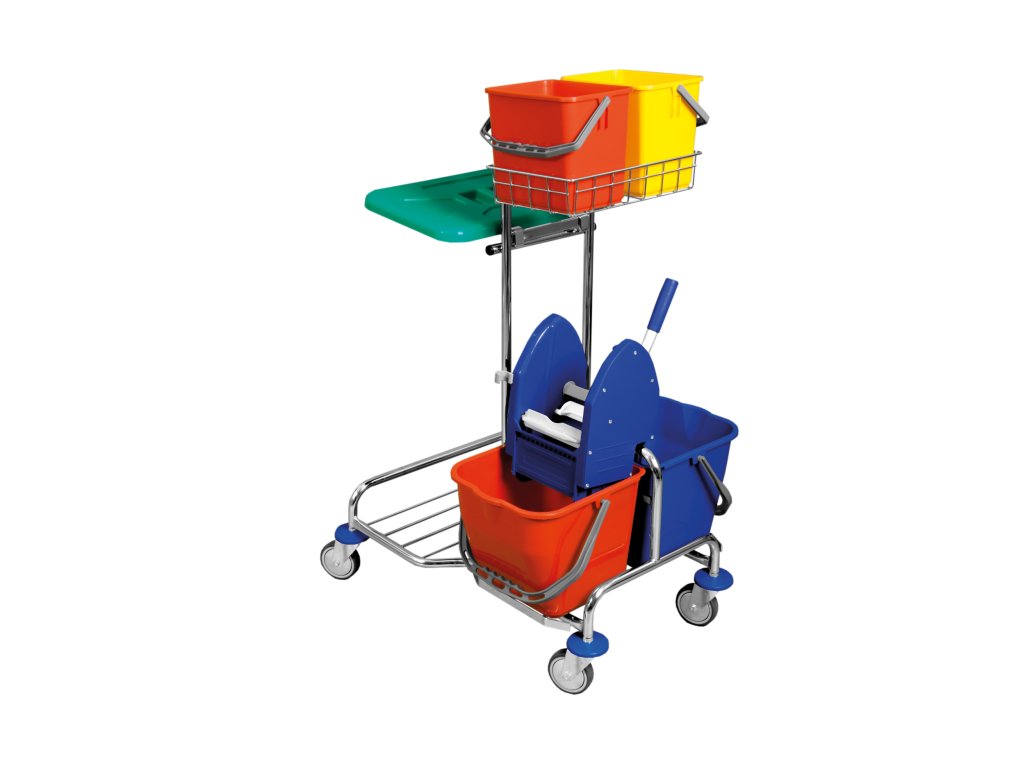 Kovový, pochromovaný vozík řady Piccolo v různých obměnách splňuje požadavky na plnohodnotný úklid podlah, sběr odpadků a mokrý úklid povrchů.