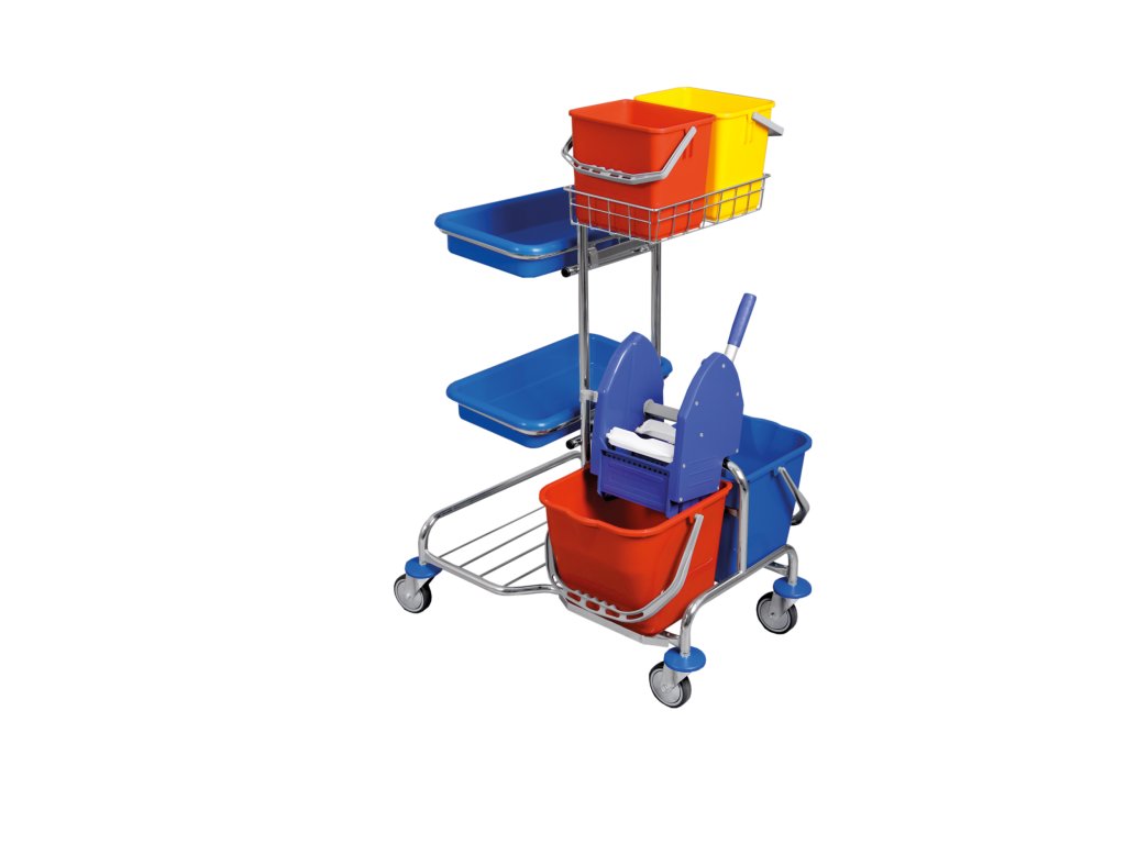 Kovový, pochromovaný vozík řady Piccolo v různých obměnách splňuje požadavky na plnohodnotný úklid podlah, sběr odpadků a mokrý úklid povrchů.