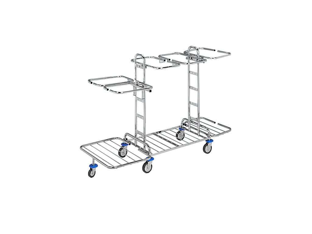 Kovový, pochromovaný podvozek Kombi s kolečky pr. 100 mm slouží jako pojízdná sestava na sběr většího množství komunálního odpadu, tříděného odpadu nebo např. použitého povlečení a ručníků. Na držácích pytlů jsou sponky na pytle.