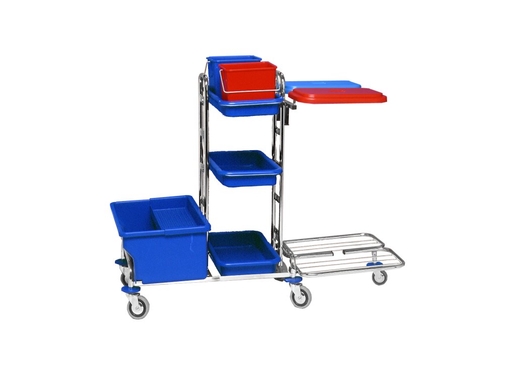 Vozík z kovových, pochromovaných trubek slouží k desinfekčnímu vytírání podlah a případně i povrchů, rozvozu materiálu i sběru odpadu. Je vybaven 2 držáky pytle o objemu 70 l, avšak pytle lze dát i 120 l nebo pouze jeden.