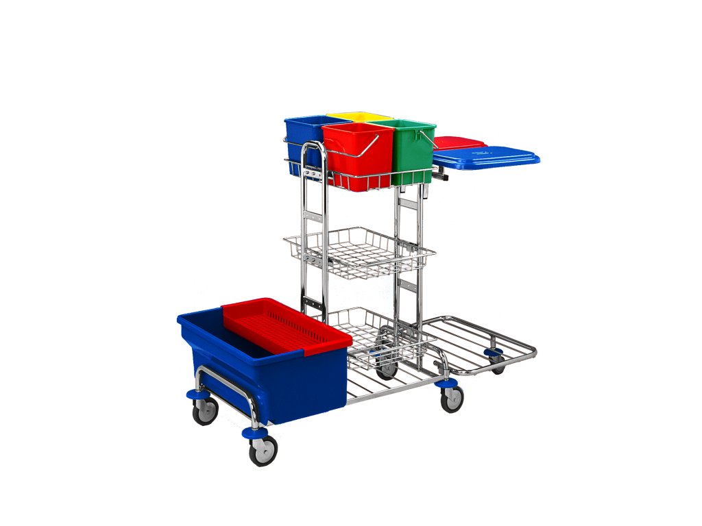 Kbelíky slouží k mytí povrchů, oken atd. Kbelíky 6l jsou v ceně vozíku. Na straně vozíku je držák pytlů 2x70 l i s víky v ceně a rošt s kolečky.