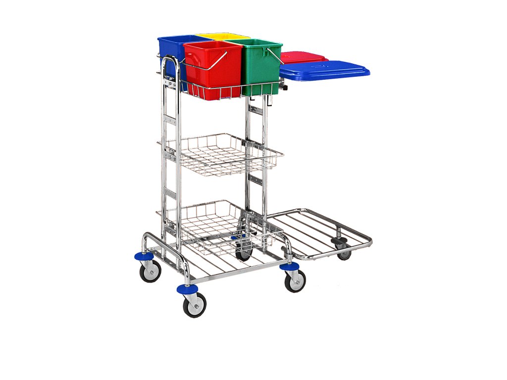 Kbelíky slouží k mytí povrchů, oken atd. Kbelíky 6l jsou v ceně vozíku. K vozíku jsou přidány 2 držáky pytle 70 l se sponkami na pytel, víka 70 l a rošt s kolečky.