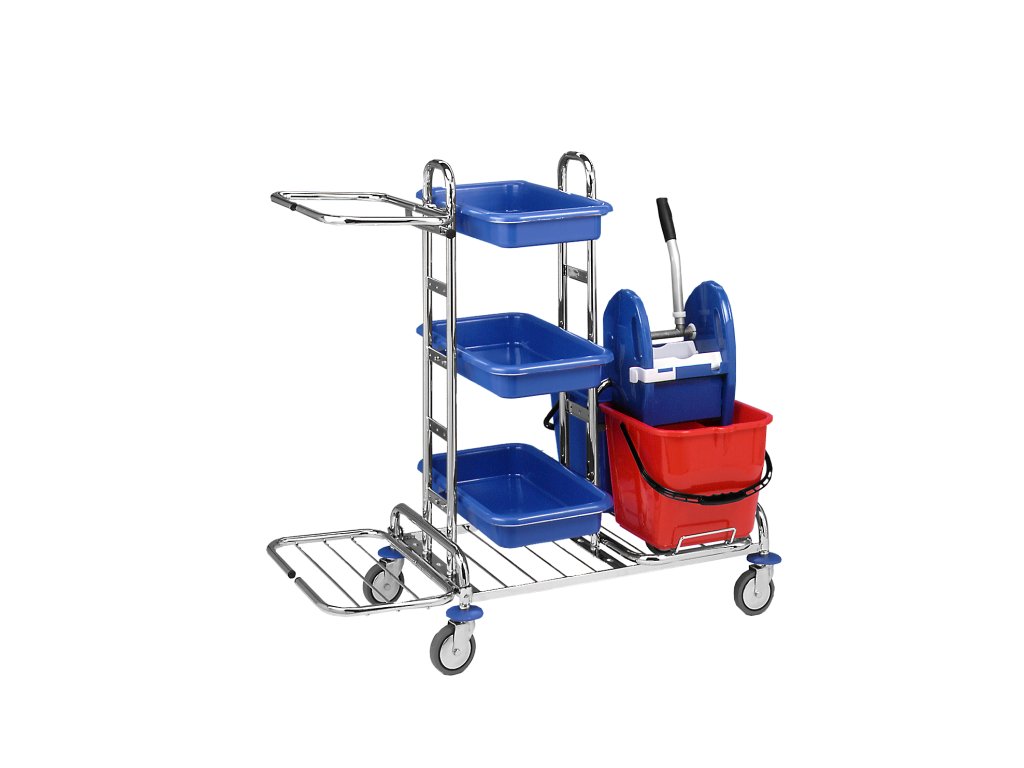 Úklidový vozík pro kompletní úklid z kovových, pochromovaných trubek je vybaven jak pro mytí podlah, tak i pro různorodý úklid a sběr odpadků.