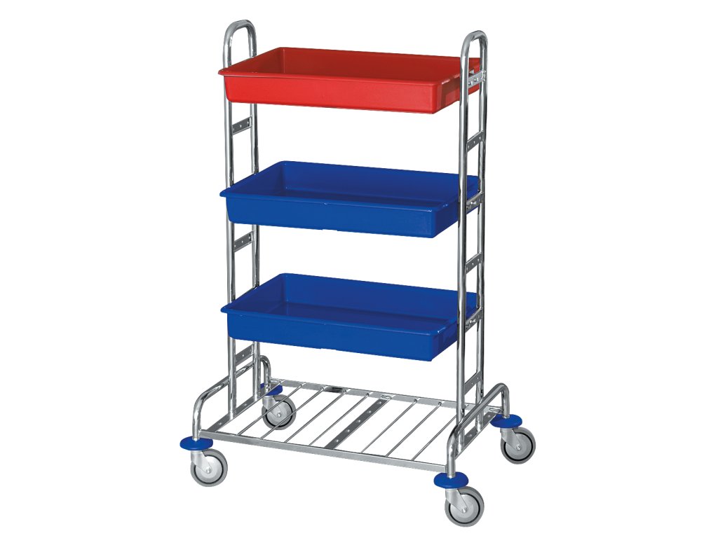Základní jednoduchá konstrukce na odkládání do plastových van. Lze rozvážet prádlo, povlečení, nádobí apod. Plastové vany Kombi Maxi mají rozměr 40x63 cm, výška 8 cm. Vozík má vyvýšená šestipříčková madla. Dle přání lze na bok vozíku přidat držák pytle nebo vany Kombi.
