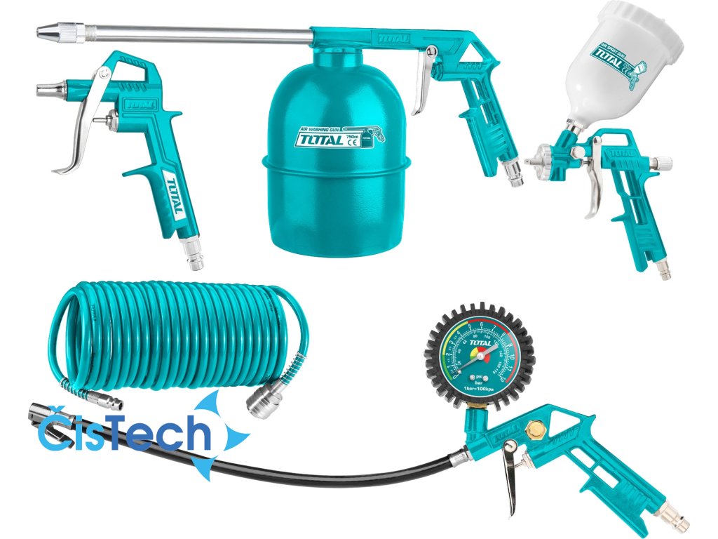 5dílná sada pneumatického nářadí je určena k běžnému použití v prostředí garáží, domácích dílen, chalup apod. a je ideálním příslušenstvím ke každému kompresoru. Skládá se z propojovací hadice na stlačený vzduch, mycí pistole, stříkací pistole, ofukovací pistole a pistole pro huštění pneumatik. Připojení kteréhokoli z nářadí s kompresorem se provádí velmi jednoduše za pomocí tlakové hadice o délce 5 metrů. Připojení je prováděno pomocí rychlospojek na koncích hadice.Doplňkové parametry