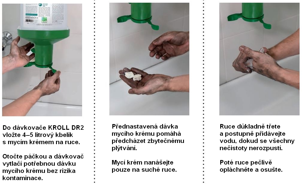 Po rozetření se postupně přidává voda, čímž se pasta aktivuje a nečistoty se začnou rozpouštět a uvolňovat. Nakonec se ruce důkladně opláchnou a osuší. Tento postup je praktický zejména v provozu, kde je potřeba rychlé a opakovatelné mytí bez složitých kroků.