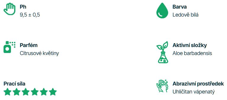 V podkladech je dále uveden extrakt z aloe vera, který podporuje příjemnější uživatelský dojem při mytí. Současně je u produktu uvedeno, že zanechává ruce hebké a příjemně vonící. To je v profesionálním provozu praktická výhoda, protože mytí rukou nebývá jednorázové, ale často opakované během směny.