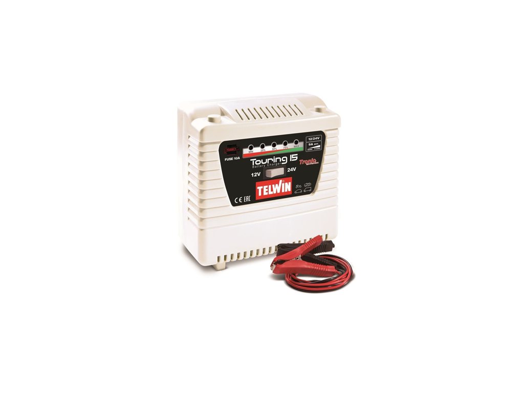 Nabíječka autobaterií Touring 15 Telwin 12/24 V pro olověné baterie s elektrolytem 50/115 Ah, vhodná pro auta a dodávky s benzinovým motorem.