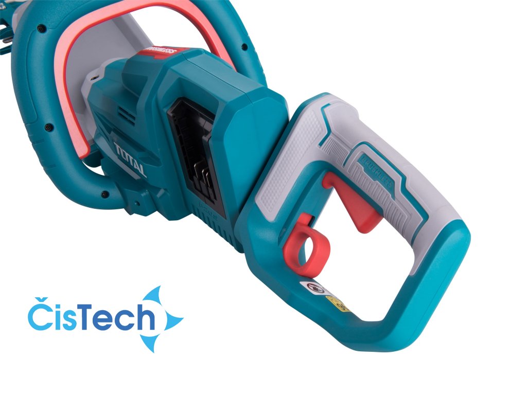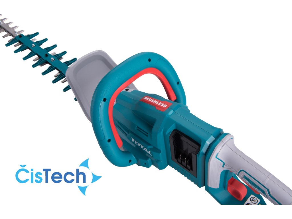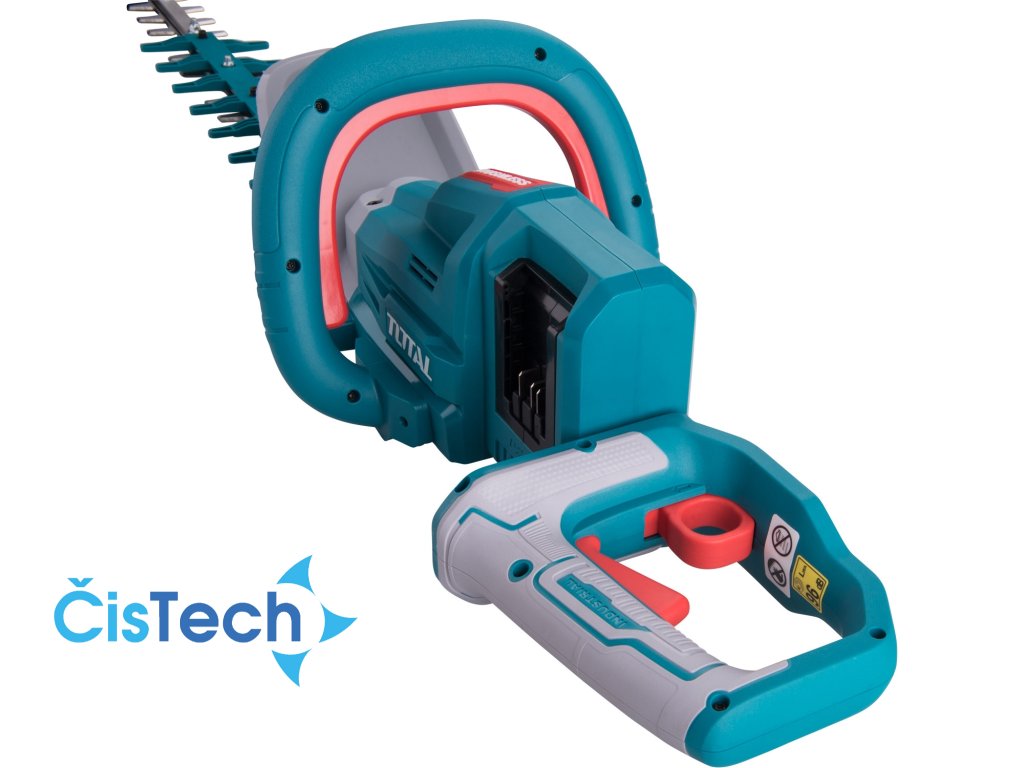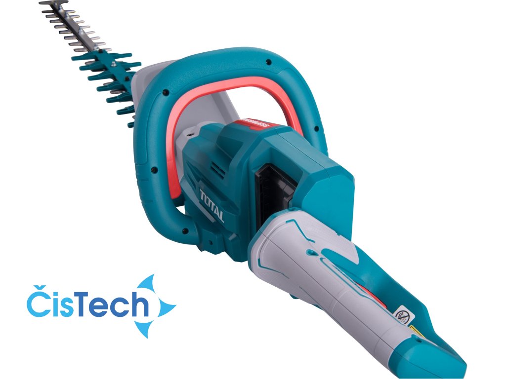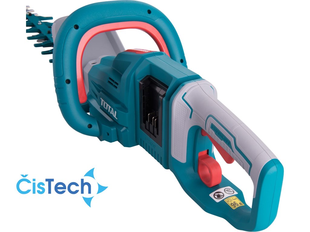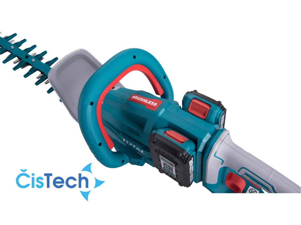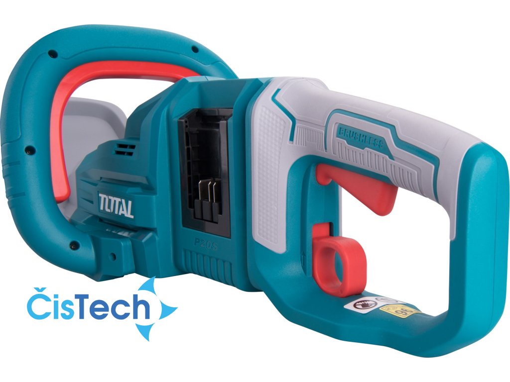 Tyto akumulátorové nůžky jsou určeny ke stříhání živého plotu, keřů, křovin a nově vzrostlých větví v domácích zahradách. Jedná se o novinku společnosti Total. Nůžky jsou napájeny dvěma bateriemi 2000mAh, čímž docílí vyššího výkonu a delší pracovní doby nůžek. Nůžky v sobě mají integrovány 3 pojistky proti spuštění, jsou vybaveny nejmodernějším bezuhlíkovým motorem a pogumovanou rukojetí, která se osvědčila jako protiskluzová. Tyto nůžky jsou součástí populární řady P20S, tedy řady 180 výrobků na jednu baterii. Pokud tedy již vlastníte nějaký bateriový výrobek z řady Total 20V, nemusíte dokupovat k tomuto výrobku baterii a nabíječku. Můžete ji použít z již zakoupeného výrobku. Nepřítomnost napájecího kabelu poskytuje svobodu a komfort při práci a manipulaci s nářadím. Nářadí lze tak s výhodou použít pro práci v místech, kde není možné použít elektrické nářadí s napájecím kabelem z důvodu nedostupnosti distribuční elektrické sítě.Doplňkové parametry