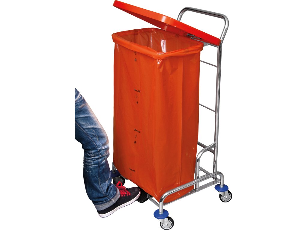 Vozík na odpad ovládaný nožním pedálem. Podvozek je osazen kolečky pr. 75 mm. Velice pohodlné ovládání nohou bez nutnosti dotýkat se víka rukou. Slouží k instalaci pytle 120 l, ale lze objednat i jako variantu na pytle 70 l. Případnou preferenci prosím zapsat do poznámky. Na držáku pytle jsou 3 spony na pytel. Igelitový pytel není v ceně.