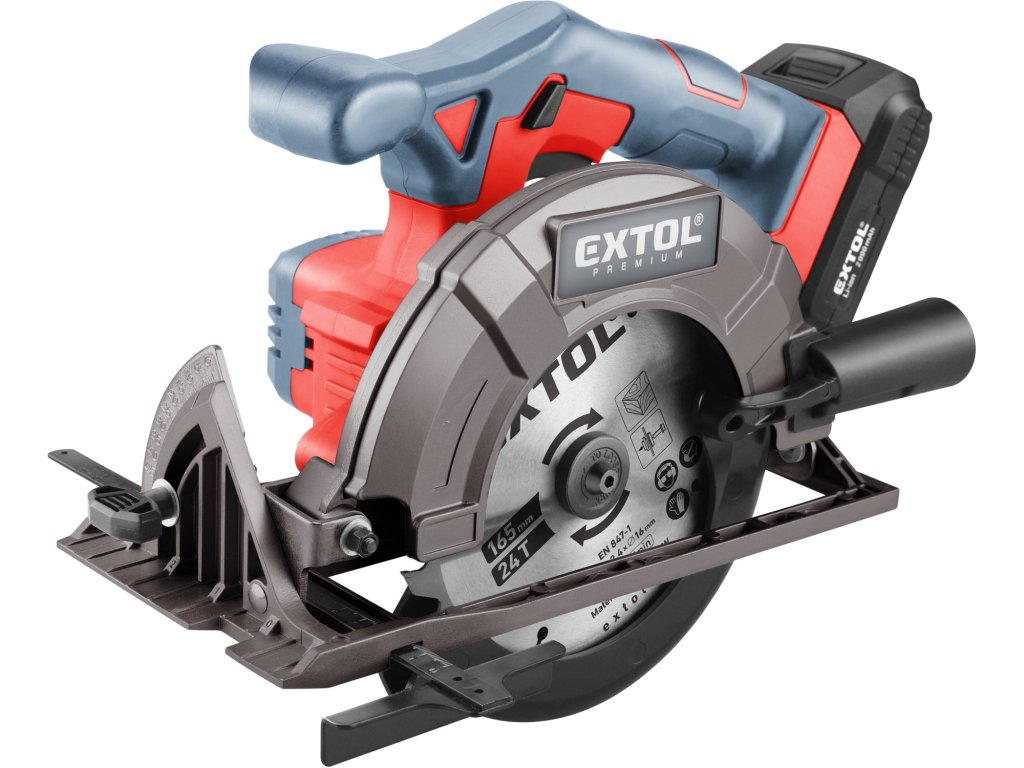Aku kotoučová pila je navržena tak, aby uživatelům poskytla výkonné a snadné řezání při různých instalatérských, elektrických, rámovacích, dokončovacích a tesařských pracích. Pila je poháněná silným motorem s otáčkami 3650/min, který umožňuje uživatelům rychle a snadno řezat tvrdým materiálem. Horní a spodní kovový ochranný kryt poskytují vynikající ochranu kotouče při pádu. Gumová měkká rukojeť je ergonomicky navržena tak, aby uživatelům poskytovala vynikající pohodlí a vyvážení pro snadno ovladatelné řezy. Pro běžnou práci dostačují jeden nebo dva 2000mAh akumulátory, které můžete rychle nabít v rychlonabíječce, pro náročnější nebo delší práci doporučujeme větší akumulátory s kapacitou 4000–8000mAh. Akumulátor lze použít ve všech typech nářadí řady EXTOL SHARE20V. Díky použité Li-ion technologii je ho možné kdykoliv dobíjet, aniž by se tím snižovala jeho kapacita. Li-ion akumulátor ztrácí energii vlivem samovybíjení velmi pomalu a vydrží dlouho nabitý a připravený k použití. EXTRA VLASTNOSTI: * pevná hliníková základna pro maximální stabilitu a přesnost řezu * možnost sklopení řezu až do úhlu 45° * vodící lišta pro podélné řezání * jednoduché nastavení hloubky řezu a nastavení šikmého úhlu * připojení odsávání umožňují zachování čistého pracovního prostředí * elektronická brzda rychle zastaví kotouč při přerušení práce * pro univerzální akumulátory SHARE20VDoplňkové parametry