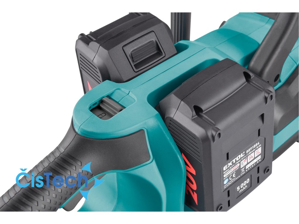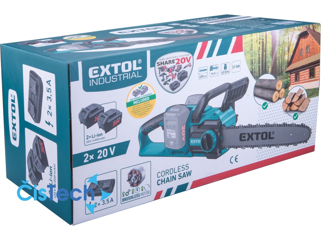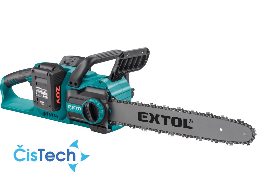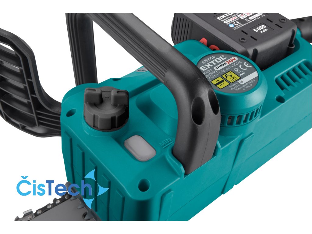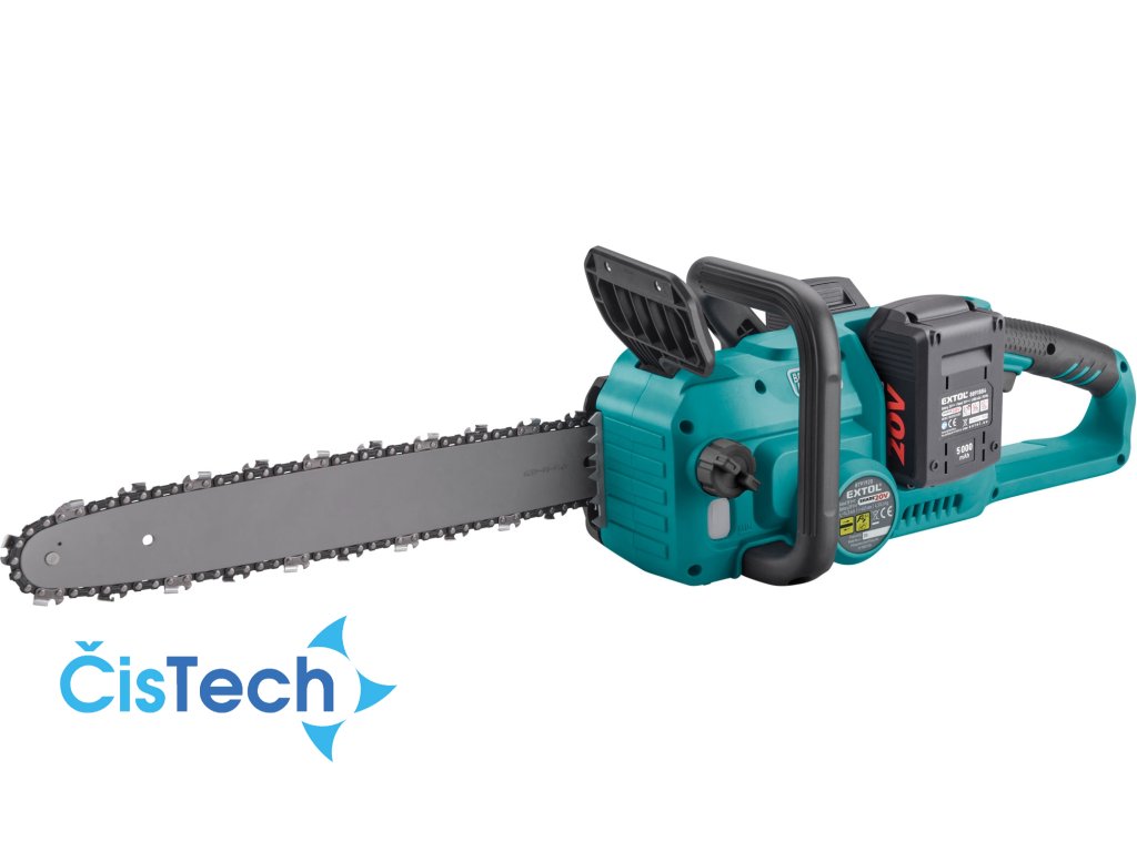 Silná aku řetězová pila je určena k provádění zkracovacích řezů dřeva, jako je např. řezání trámů, kácení stromů s přiměřeně silným kmenem, k odvětvování kmenů, k řezání kmenů či silných větví na palivové dřevo. Aku řetězová pila spojuje výhody elektrických pil – nízký hluk, jednoduchost obsluhy a údržby se svobodou pohybu u benzínových pil. Je vybavena kvalitní vodící lištou a pilovým řetězem. Mazaní řetězu za chodu je automaticky zajišťováno čerpadlem. Pohon zajišťuje nejmodernější „brushless' motor. Tento nový typ motoru eliminuje tření a ztráty energie při provozu, čímž dosahuje vyšší životnosti a výkonu, při menší spotřebě el. energie než klasické motory s uhlíkovými kartáči. Vysoký výkon brushless motoru se velmi dobře využije při zpracování dřeva, kdy dovoluje chod pily i při rychlejším řezání. Pila je také vybavena beznástrojovým systémem pro snadnou a rychlou výměnu řetězu a mechanismem pro jednoduché vypnutí řetězu. Vysokou bezpečnost zajišťuje bezpečnostní pojistka, která se aktivuje při vyklouznutí z rukou nebo při “kopnutí” pily a elektronickou doběhovou brzdou, která zajistí jeho rychlé zastavení. Pogumovaná rukojeť brání vysmeknutí, tlumí vibrace a zpříjemňuje držení při práci. Na spodní straně pily je otvor pro jednoduché zavěšení na zeď. Akumulátor je vybaven ukazatelem nabití, což umožňuje uživateli si rozvrhnout délku práce a dát si včas nabít další akumulátor. Pro běžnou práci dostačují dva 4Ah akumulátory, které můžete rychle nabít v rychlonabíječce, pro náročnější nebo delší práci doporučujeme větší akumulátory s kapacitou 6–8Ah. Akumulátor lze použít ve všech typech nářadí řady EXTOL SHARE20V. Díky použité Li-ion technologii je ho možné kdykoliv dobíjet, aniž by se tím snižovala jeho kapacita. Li-ion akumulátor ztrácí energii vlivem samovybíjení velmi pomalu a vydrží dlouho nabitý a připravený k použití. EXTRA VLASTNOSTI: * silný „brushless" motor * snadné napnutí a výměna řetězu * automatické mazání řetězu * bezpečnostní pojistka a brzda * závěs na zeď * ukazatel stavu nabití baterie * univerzální akumulátor SHARE20VDoplňkové parametry