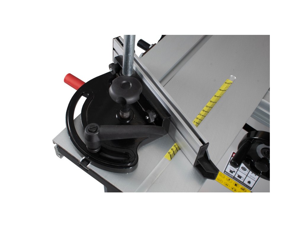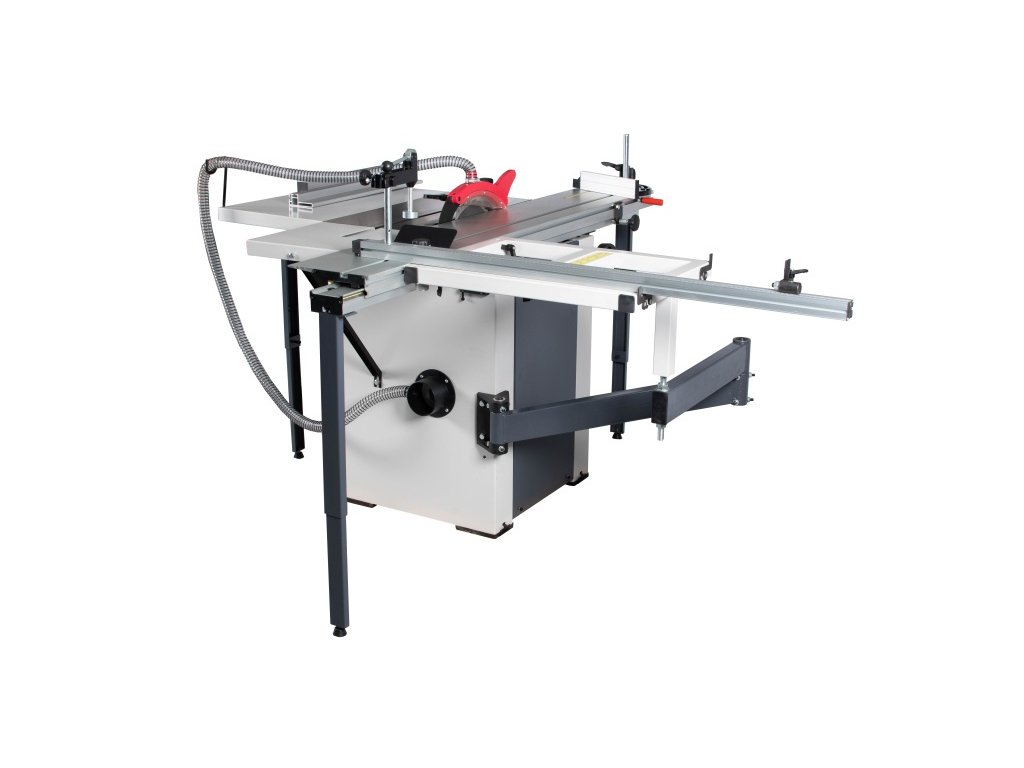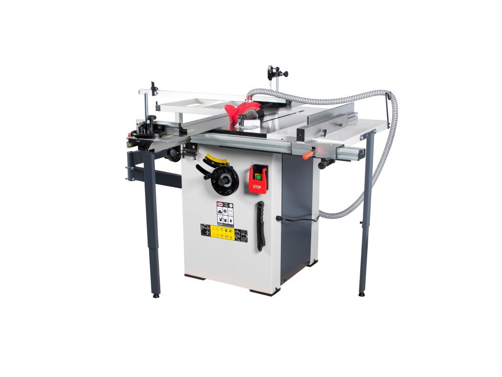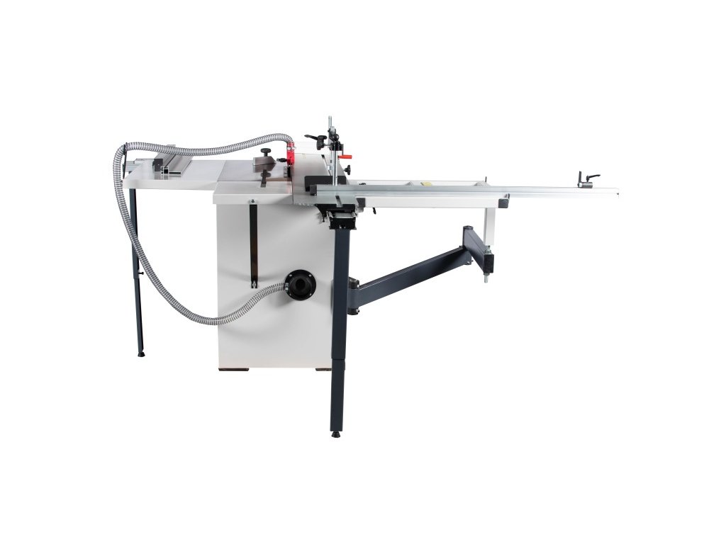 Výkonný hnací motor zaručuje optimální výkon při řezání i při delším provozu. Stabilní a snadno nastavitelný pilový agregát naklápěcí v úhlu od 90° do 45°. Pila je sériově dodávaná s posuvným hliníkovým formátovacím stolem s velikostí 1600 x 240 mm. Sériově je pila vybavená rozšiřovacím a prodlužovacím stolem pro zpracování velkoformátových desek. K přípojce pro odsávání lze připojit hadice o průměru 100 mm a zajistit tak optimální pracovní podmínky. Naklápění pilového kotouče až do 45° podle stupnice je pomocí ručního kola. Masivní stůl pily z šedé litiny, který je přesně opracovaný a broušený do roviny je vybaven T-drážkami umožňuje řezání s úhlovým dorazem. Kombinovaná konstrukce stroje z oceli a litiny je odolná proti zkroucení.