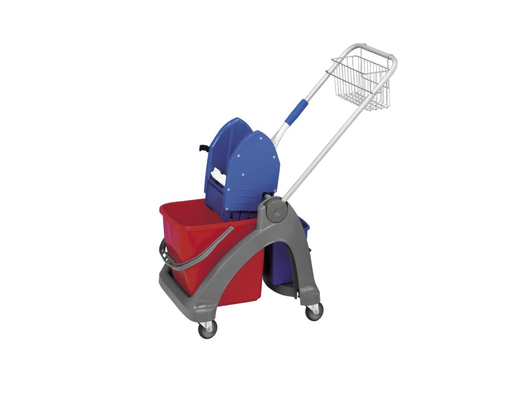 Plastový vozík s kbelíkem 25 l, kbelíkem 5 l a ždímačem. Napevno nasazená kolečka. Vodítko je hliníkové.