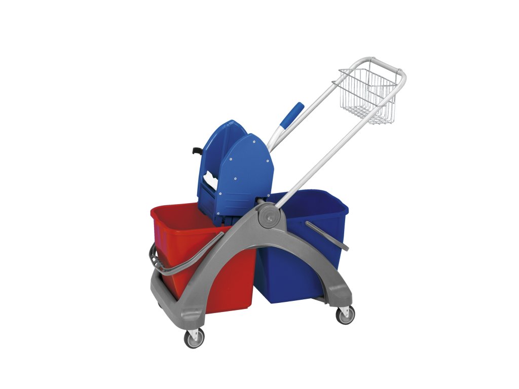 Plastový vozík s 2 kbelíky 25 l a ždímačem. Napevno nasazená kolečka. Vodítko je hliníkové.