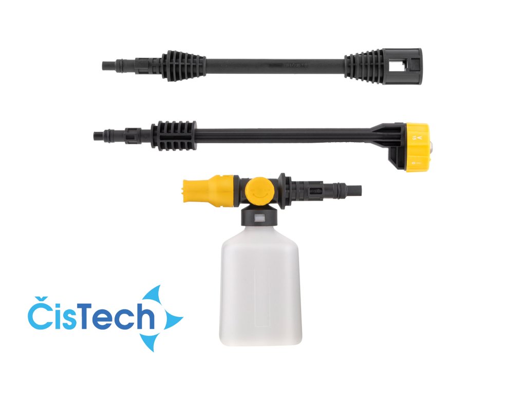 Myčka je dodávána v odolném plastovém kufru, který zajišťuje snadné přenášení i bezpečné uložení celého příslušenství. Je vybavená multifunkční tryskou s 6 nastavitelnými typy paprsků.