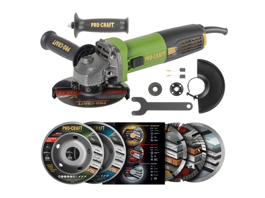 Sada úhlová bruska Procraft PW1050 a 3x diamantové kotouče DS3.125 + 2x hrncové kotouče